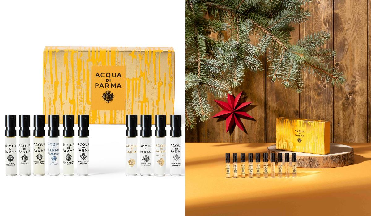 直接收入Acqua di Parma最受歡迎的香氣!「金色假期經典探索香氛禮盒」一次收入10款香味,克羅尼亞經典淡香精、克羅尼亞經典古龍水、早安淡香精、藍色地中海卡布里香橙珍釀淡香精、藍色地中海帕納里加州桂珍釀淡香精、藍色地中海阿瑪爾菲無